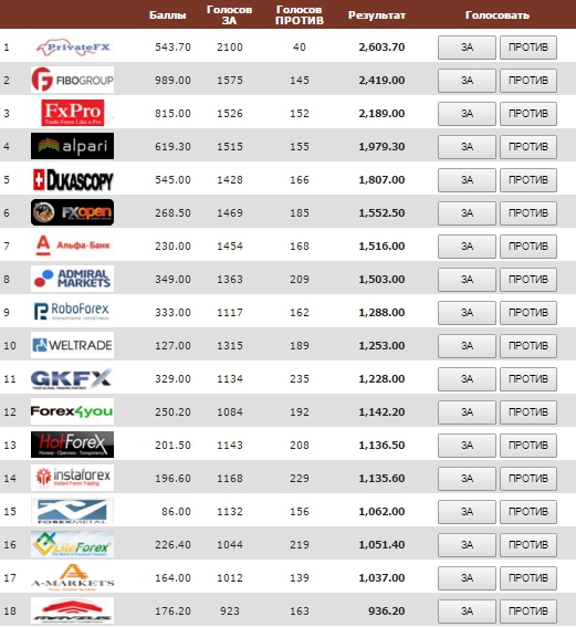 У номінацію на кращий ПАММ-рахунок брокерів валютного ринку Forex включені компанії, що входять в найбільш авторитетний на сьогоднішній день міжнародний рейтинг брокерів Форекс Академії Masterforex-V. Як видно з наведеної таблиці в номінації враховуються і бали даного рейтингу (у PrivateFX 543,7 балів, у Fibo Group 989, FxPro 815,00 і т. Д.), А також результати голосування на сторінці кращого брокера для початківців трейдерів.