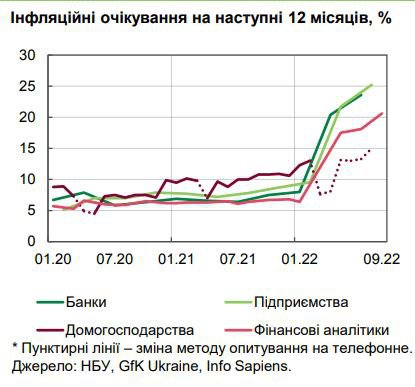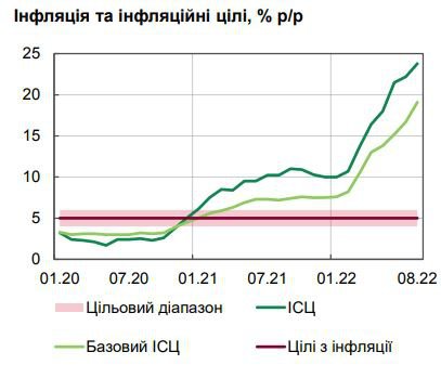 У липні інфляція в Україні становила 22,2% у річному вимірі. А в серпні показник був 23%. Інфляційний тиск залишається значним. Ефекти війни, зокрема руйнування виробництв і логістики, надалі мають визначальний вплив на ціни майже всього споживчого набору товарів і послуг. Швидкість відновлення української економіки та повернення інфляції на траєкторію сповільнення значною мірою залежать від строків завершення активної фази війни.
