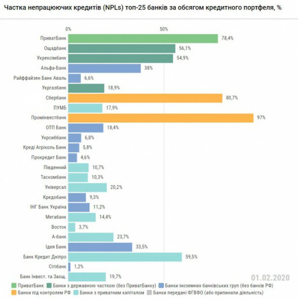 У банківській системі України частка кредитів, що не працюють, становить 48,4%. Більшу частину з них зосереджено в державних банках.