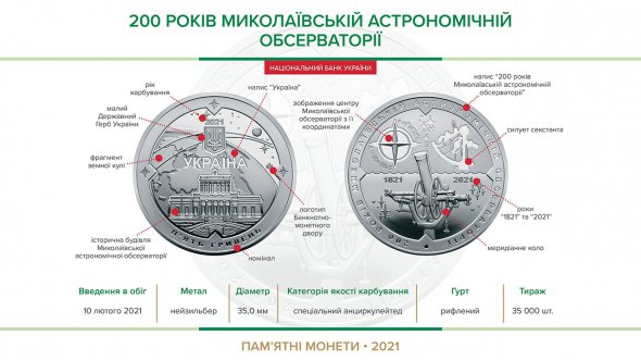 Національний банк України впроваджує в обіг 2 пам'ятні монети, присвячені 200-річчю Миколаївської астрономічної обсерваторії і 250-річчю обсерваторії Львівського університету.