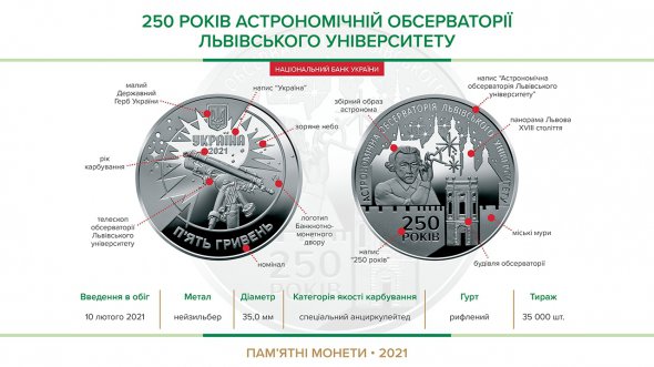 Пам'ятна монета "250 років Астрономічній обсерваторії Львівського університету" присвячена науково-дослідній установі Львівського національного університету ім. Івана Франка, одній із найстаріших обсерваторій Східної Європи — заснована 1771-го.