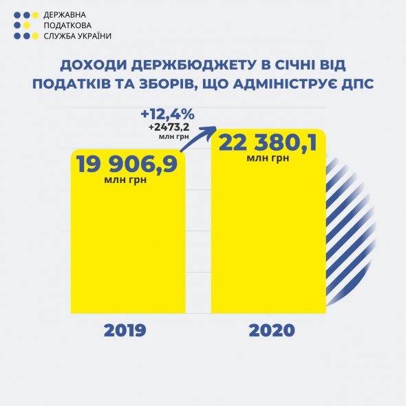 У січні доходи загального фонду державного бюджету від податків та зборів, що адмініструє Державна податкова служба, із врахуванням сум відшкодованого податку на додану вартість становили 22 млрд 380,1 млн грн. Це на 12,4%, або на 2 млрд 473,2 млн грн, більше, ніж у січні минулого року.