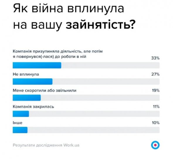Через російську агресію 30% українців залишилися без роботи. З них 19% скоротили або звільнили, в 11% – закрилася компанія.