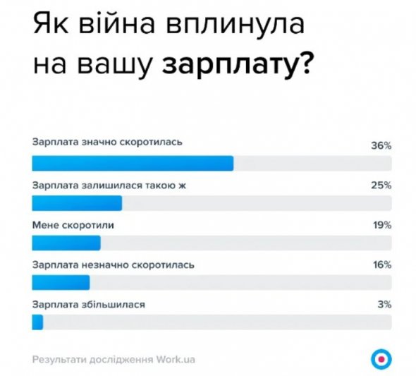На запитання "Як війна вплинула на вашу зарплату?" чверть опитаних зазначили, що зарплата не змінилася, а в 16% – скоротилася незначно. Водночас у 3% респондентів зарплата збільшилася. Через війну значно скоротили зарплати 36% опитаних.