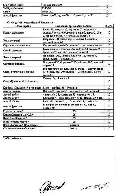 Ресторанне харчування коштуватиме 1,49 млн грн. Передбачено обіди та VIP-обіди, фуршети та VIP-фуршети на десять персон по кілька разів на місяць, постійне буфетне забезпечення приймалень напоями та кондитерською продукцією.