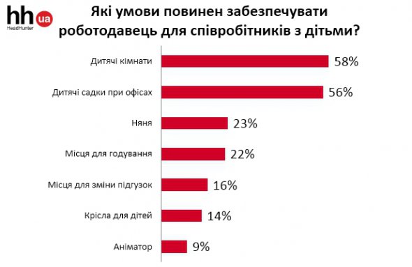 Ще 22% потребують наявності в офісах місць для годування, а 16% – спеціальних місць для зміни підгузок. 14% опитаних хотіли б мати на роботі спеціальні крісла для дітей. Водночас 9% вважають, що в офісі має бути аніматор, який розважатиме дітей, поки батьки працюють.
