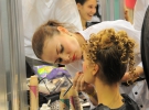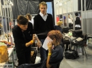"Девушки, разбейтесь по парам и занимайте места возле зеркала. Одной делают прическу, другой - макияж. На каждую по 15 минут. Давайте скорее. К показу - час и 10 минут", - кричить перукар Олександр.