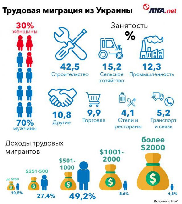 У Нацбанку заявляють, що за минулий рік кількість трудових мігрантів в Україні зросла до 8%. З січня 2010-го по червень 2012 року за кордоном працювали 3,4% працездатного населення країни віком від 15 до 70 років.