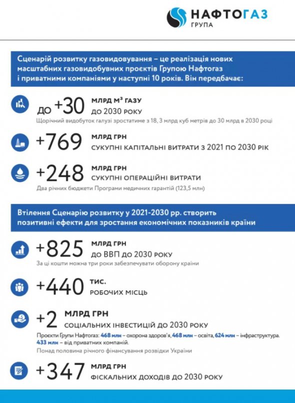 Реалізація нових масштабних газовидобувних проєктів створить потужний економічний ефект до 2030 року. А саме, додасть 825 млрд грн до ВВП країни, 347 млрд грн фіскальних доходів та створить 440 тис нових робочих місць.