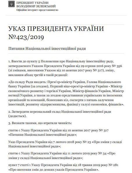 "До складу ради входять: прем'єр-міністр України, голова Національного банку України (за згодою), перший віце-прем'єр-міністр України - міністр економічного розвитку і торгівлі України, міністр фінансів України, міністр юстиції України, а також за згодою представники українських та іноземних організацій і компаній, ділових кіл, експерти з питань залучення інвестицій, розвитку підприємництва, фахівці в галузі економіки, фінансів", - зазначається в зміненому указом п. 5 положення про Національну інвестиційну раду.
