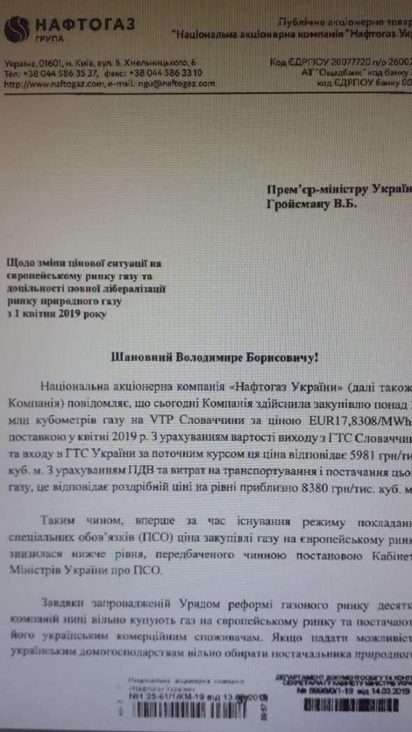 "Нафтогаз закупив газ на точці Словаччини за ціною 5981 гривень за тисячу кубометрів. З урахуванням ПДВ та витрат на транспортування і постачання це відповідає роздрібній ціні на рівні близько 8380 гривень", - написав голова правління НАКу Андрій Коболєв у листі до Володимира Гройсмана, повідомляє Економічна правда.