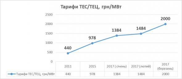 Коли заходить мова про дорогу електроенергію, найперше воліють згадувати поширений штамп про "зелені тарифи", які, мовляв, найвартісніші серед усіх видів генерації на ОРЕ. Але - о, диво! – ці тарифи не зростають, а навіть зменшуються, а от тарифи крупних ТЕС та ТЕЦ зростають стрімкими темпами (з 2011 по 2015 зріс вдвічі з 440 до 978 грн за 1 МВт×год, а в січні 2017 - більш ніж втричі: 1384 грн за 1 МВт×год, без ПДВ, станом на лютий 2017 досягнуто зростання майже вчетверо - 1484 грн за 1 МВт×год, без ПДВ, у березні ТЕСи продавали ел/ен по 2000 грн за МВт).