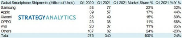 За перший квартал 2021 року продали 77 млн мобільних телефонів Samsung, йдеться у звіті компанії Strategy Analytics. Усього в світі продали 340 млн пристроїв, що на 24% більше за аналогічний показник у минулому році.