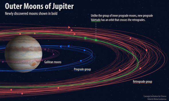 Особливий інтерес для вчених представляє один з нових супутників, який знаходиться на дуже великій відстані від Юпітера, щоб входити в групу проградних супутників, але обертається в тому ж напрямі, що і планета. Цей об'єкт отримав назву Валетудо - за римським імені богині здоров'я.
