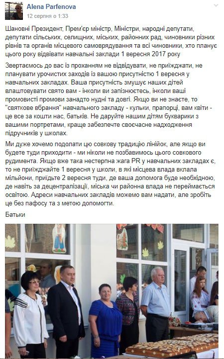Батьки школярів розмістили у соцмережах заклик до президента, депутатів, міністрів та чиновників не приїздити 1 вересня на шкільні лінійки.