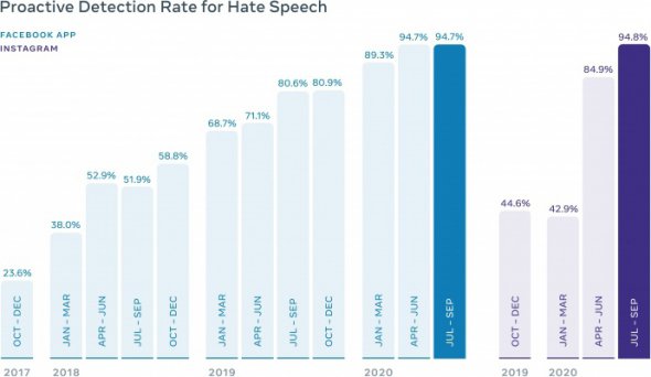Facebook заявив, що швидкість виявлення забороненого контенту збільшилася в зв'язку з поліпшенням роботи інструментів штучного інтелекту. Вони допомагають виявляти риторику ненависті ще до отримання скарг від користувачів.