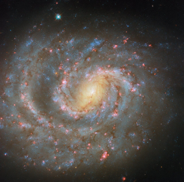 "У спіральних рукавах галактики можна побачити рожеві хмари, багато з яких мають блакитні зорі. Рожевий колір походить від атомів водню, що підсвічується ультрафіолетовим світлом молодих масивних зірок. Це контрастує з теплим жовтим сяйвом центру галактики, де розташована щільна колекція старіших зірок більш червоного кольору", - йдеться у повідомленні.