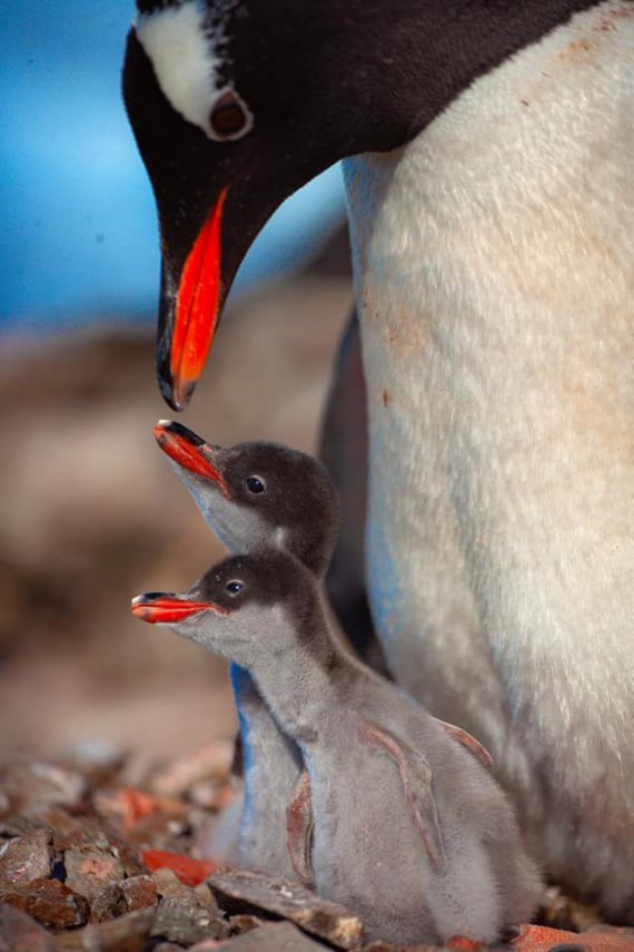 "Щоб попоїсти, пінгвінята залазять дзьобиком тату чи мамі в рот, а той "постачає" зі стравоходу порції "смаколиків". Збоку це іноді може виглядати так, ніби дорослий пінгвін намагається проковтнути малого", ‒ розповіли полярники.