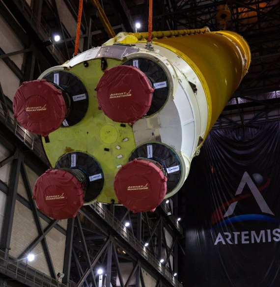 У п'ятницю та суботу команди Космічного центру Кеннеді використовували важкий підйомний кран, щоб спочатку підняти основну частину, перенести її та встановити на місце між в конструкції, яка називається мобільна пускова установка. В даний час ця структура знаходиться всередині величезного кубоподібного Будинку автомобілів (VAB).