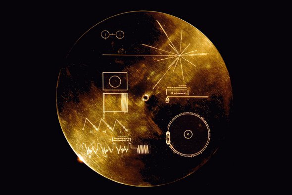 На золотій пластині записали вітання на 55 мовах світу. Там також записана класична музика, звуки природи, зображення людей і тварин. На пластині зберігаються координати Землі та Сонячної системи.