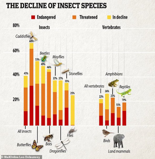 За останні 10 років на 53% скоротилася кількість усіх видів метеликів. 46% бджіл перебувають у занепаді. На 37% зменшилася кількість бабок і на 49% жуків.