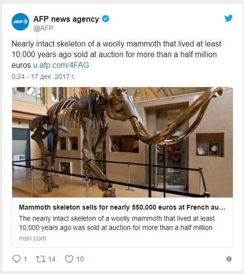 На аукціоні у французькому Ліоні продали скелет мамонта з Сибіру за € 548 тис.