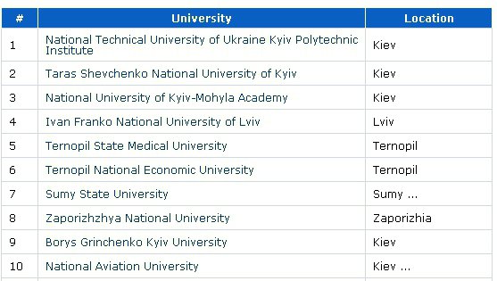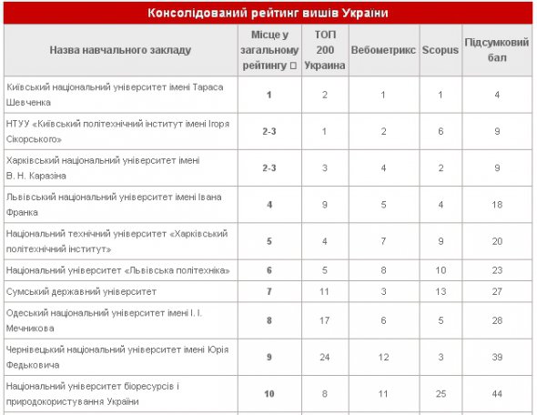 Видавнича служба "Уран" сформувала рейтинг українських вузів. Як вихідні дані для складання консолідованого рейтингу вищих навчальних закладів України використали найавторитетніші серед експертів та засобів масової інформації національні та міжнародні рейтинги вузів України: "Топ-200 Україна", Scopus та "Вебометрикс".