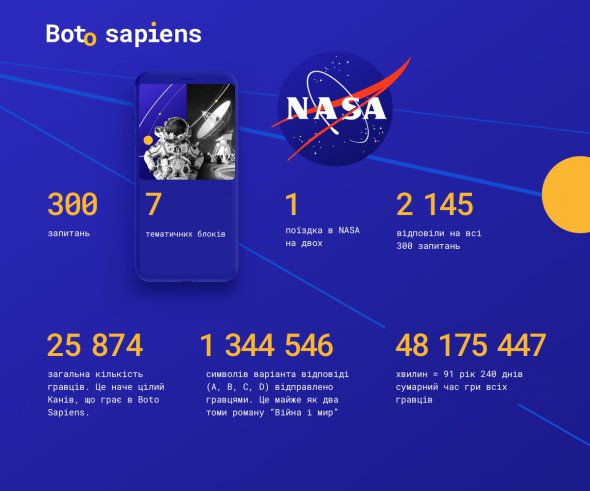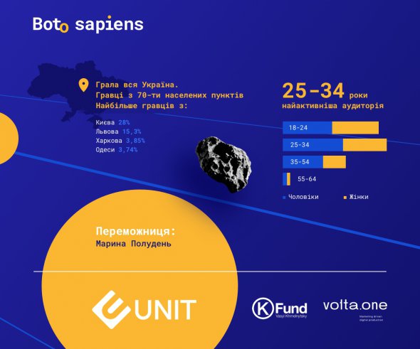У Boto Sapiens брали участь гравці з 70 населених пунктів країни. Марина Полудень обігнала 25,8 тис. учасників гри за 442 хв. Крім того, відповіла на 300 запитань чат-бота про космос, астронавтику і Всесвіт.