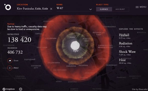 Автори проекту Outrider опублікували інтерактивну карту з можливими наслідками ядерного вибуху в будь-якій точці світу.