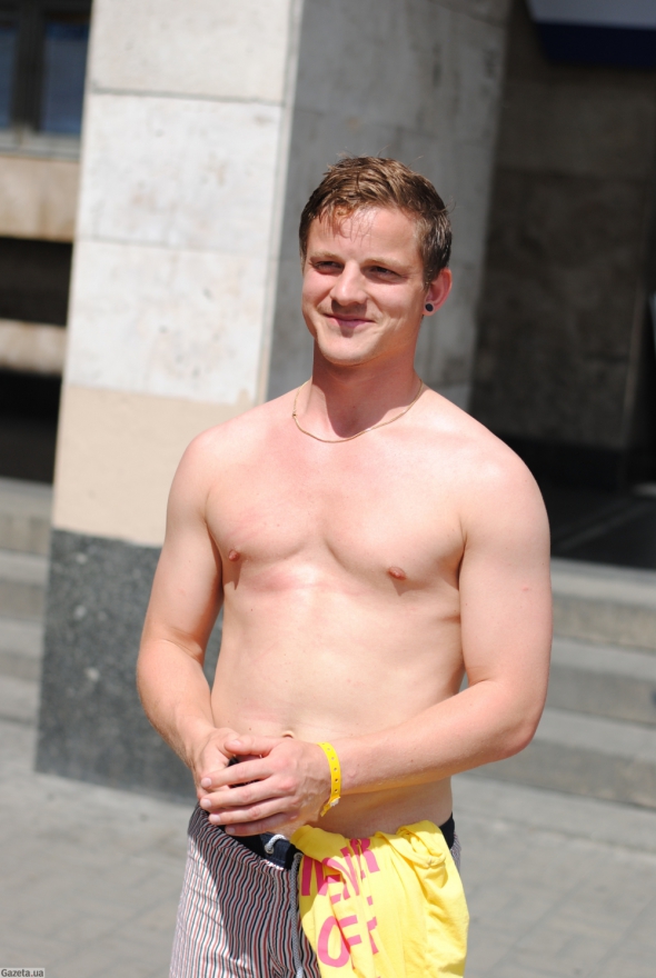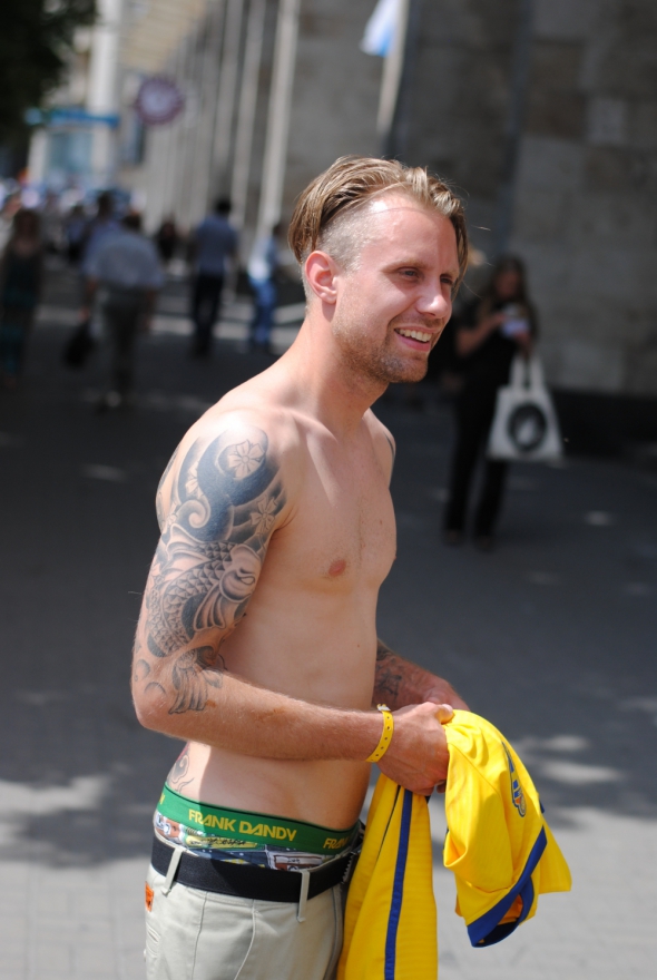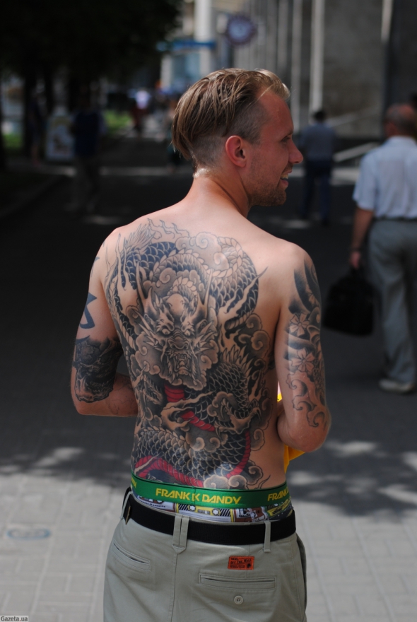 Ерік Барнек, 25 років, та 29-річний Ерік Андерсон зі шведського міста Гетеборг гуляють на Майдані біля будинку профспілок. У Андерсона вся спина в татуюваннях. Він охоче дає себе фотографувати. Поки фотографуємо спину, знімає штани. Показує, що на попі теж татуювання.