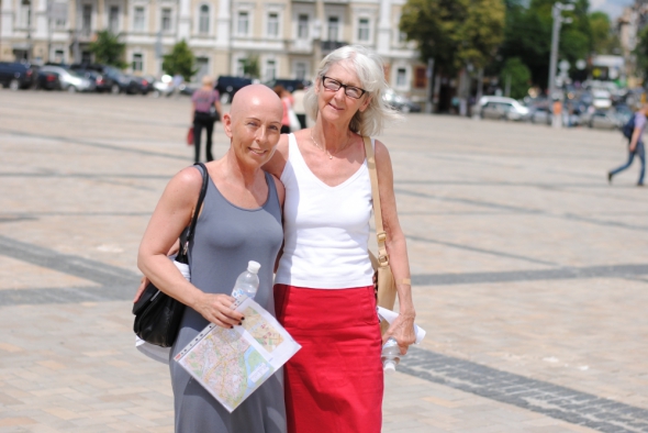 Дві шведки Гюндел Лінстрон, 50 років, та 65-річна Гунілла Ульстрон стоять на площі біля Софійського собору. Туристки поселились у готелі "Либідь". Розглядають мапу Києва. Приїхали в день матчу "Україна-Швеція".
