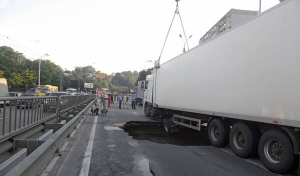 Яма 6 метрів завглибшки, діаметром до 10 метрів руйнує дві смуги проїжджої частини. За 5 хвилин у Києві утворюється багатокілометровий затор. Вантажівку піднімуть із ями за 2,5 години.