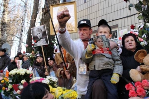 Праворуч від сцени стоїть жінка з табличкою "Тимошенко - муза помаранчевої революції". Під воротами ізолятора радянський дисидент 56-річний Петро Вінс пропонує присутнім випити шампанського за Юлію Тимошенко. Біля його ніг стоїть пакет із п'ятьма пляшками "Советского".
