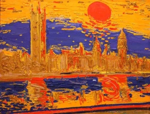 "Лондон" написав із фото та за уявою, так часом цікавіше. Поїду туди навесні. Знаю іспанців, які не були в Парижі, а чудово його малюють. Використав мінімальний колорит - темне й світле золото, синій із вкрапленням червоного.