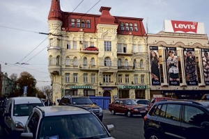 Біля будинку кіоск, де продають цигарки, каву й картки мобільного зв'язку. Перехожим звідси автомобіля не видно. На першому поверсі – відділення Ощадбанку.