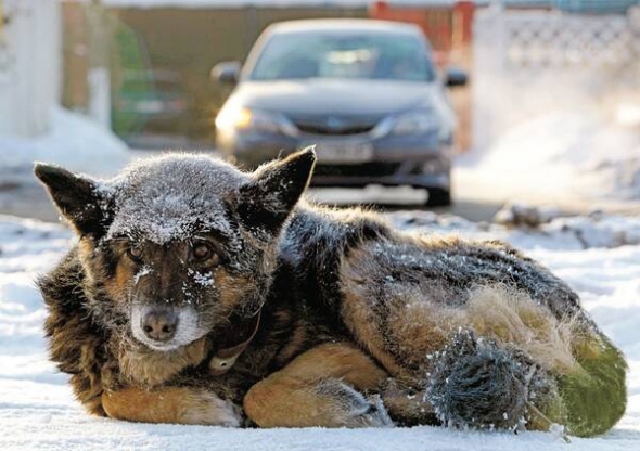 7-місячний пес Полкан чекає господаря біля Іллінської церкви на столичному Подолі. Лягає на дорогу, скручується калачиком, лапи кладе під себе. Термометр показує - 27 °С.