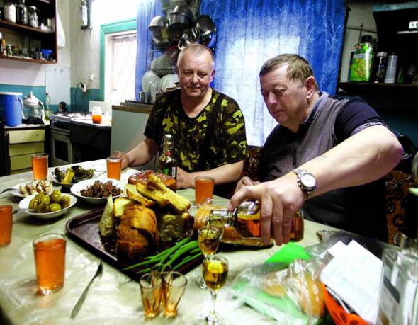 За столиком при вході – його компаньйон із пляшкою Nemiroff. Усі відвідувачі буфету замовляють по пляшці горілки.