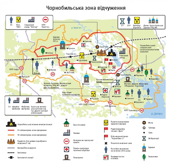 92 населені пункти розташовані на території Чорнобильської зони відчуження. Серед них є два міста й два селища. На початку 1986 року там проживали 185 тис. осіб. Сьогодні – близько 3,5 тис. Це працівники закритої атомної станції, персонал зони, поліція та прикордонники. Діють лабораторії з дослідження радіації. Близько 300 місцевих повернулися до рідних домівок.