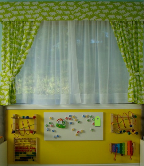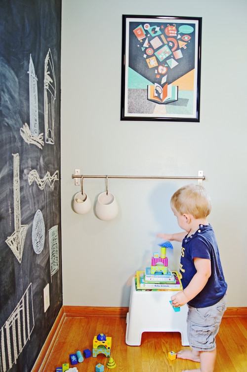 М'які настінні кишені забезпечують хороше місце для улюблених іграшок. Навіть молодші діти можуть оцінити, як приємно діставати з м'яких кишень свої іграшки. Старшим можуть сподобатися підвішені відра, наповнені крейдою, поруч з дошкою для малювання на стіні.