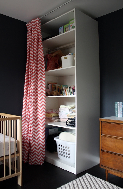 Стелажі на всю стіну - від підлоги до стелі - справжня знахідка для батьків, особливо, якщо ви живете у невеликому просторі. Але у відкритому стелажі не завжди легко зберігати порядок. Аби приховати деяку неідеальність, повісьте довгі штори, які будуть закривати стелаж.
