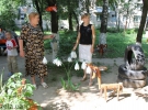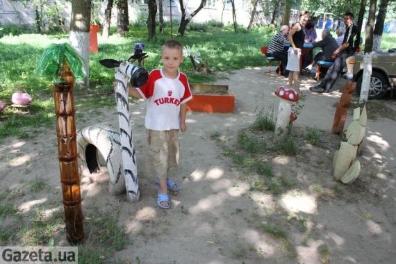 "Чоловіки варили підставки, прибивали їх до дерев, - продовжує майстриня. - Коли обкопували землю, звідти дістали смішний корінь. Оглянули його, а він схожий на козлика. Так і встановили його біля лавки. Он із землі стирчать дві покришки, там будуть лебеді на озері. Ми їх ще не встигли доробити. Сусіди з інших під'їздів просять придумати щось і біля їхніх під'їздів, треба буде щось новеньке придумати".