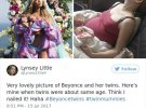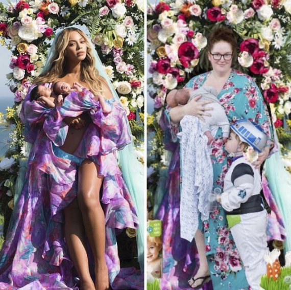 Мати двох двійнят і 6-річного сина з Ірладії Шерон Келлевей вважає, що Бейонсе на своєму фото "виглядала настільки нереалістичною", що вона вирішила зімпровізувати і створити власний варіант. Фотографії жінка опублікувала в Facebook, вони швидко стали вірусними, пише 24tv.ua