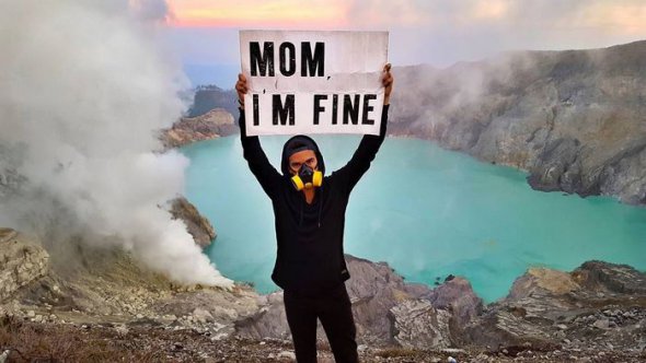 Мандрівник Джонатан Квіньозес винайшов оригінальний спосіб, як повідомляти матері, що з ним усе гаразд. Чоловік фотографується в різних країнах із табличкою Mom, I'm fine (Мамо, у мене все добре).