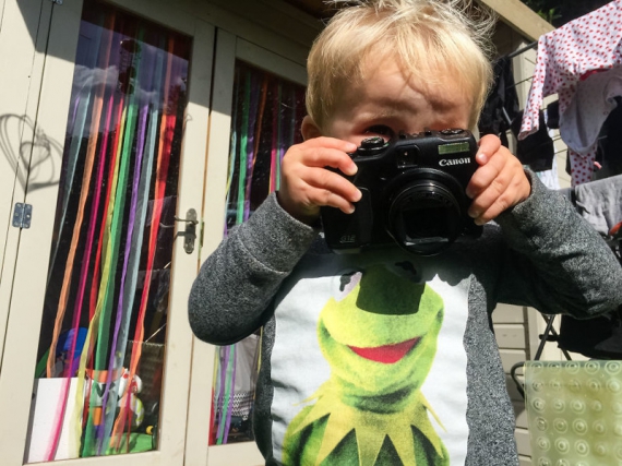 Півторарічний Стен навчився користуватися фотоапаратом і кричати слово "cheese" при натисканні на кнопку спуску затвора. У колекції малюка є кілька іграшкових камер, але днями тато віддав йому старенький Canon G12.