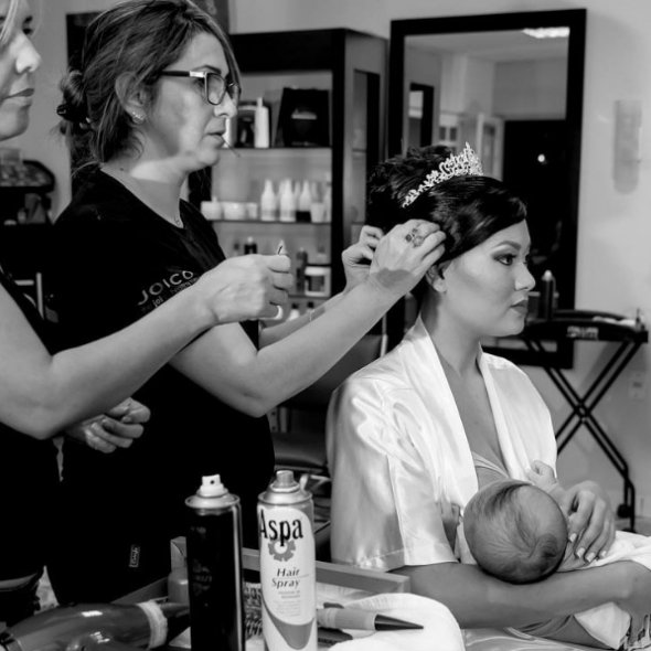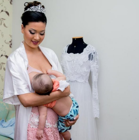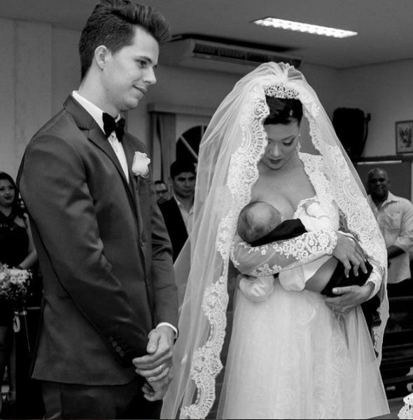 24-річна Даніела Катсуе з Бразилії нагодувала грудьми 3-місячного сина Кауа під час власної шлюбної церемонії. Наречена обмінялася клятвами вірності з 26-річним нареченим Кале Ріосом.