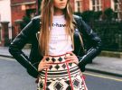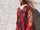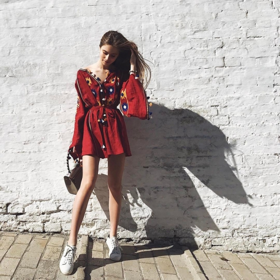 На своїй сторінці в соцмережі Instagram модель опублікувала знімок. Позує в яскравій червоній сукні-вишиванці з широкими рукавами. Вбрання довжини міні прикрашена орнаментом і кольоровими бубонцями. Образ доповнений сумкою на короткій ручці та білими кедами.