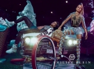 Зірка позувала в коротких топах та обтягуючих брюках. Чорний одяг прикрашений золотистим принтом візерунків. В іншому образі постала в коротких шортах та жакеті, що зроблені з сріблястої тканини у тигровий принт. Вечірній образ створили короткої сукні та короткого жакету в золотисто-чорних тонах.