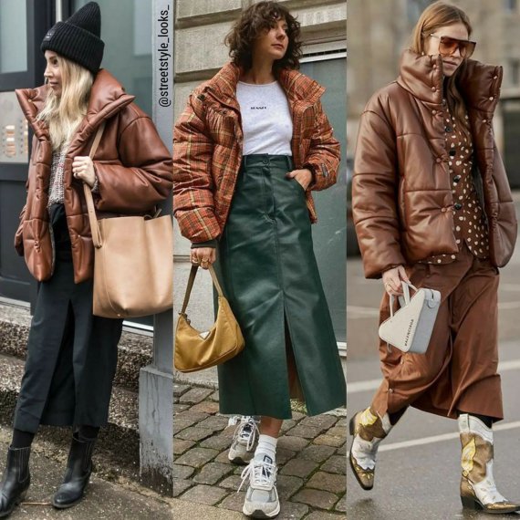 Короткі пуховики можна поєднати зі спідницями максі, трикотажною або спідницею-олівцем. Для морозної зими обирайте довгу куртку, під яку можна вдягнути мідіспідницю.