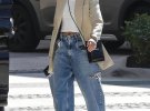 Хейлі Болдуін створює образи з об'ємних речей скомбінувавши широкі джинси в комплекті з жакетом вільного крою і човниками неонового кольору.