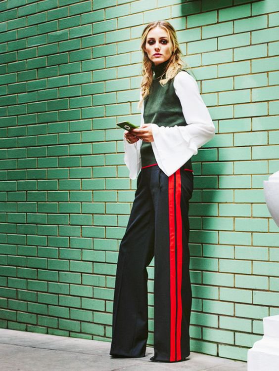 Брюки з лампасами роблять образ екстравагантними та додають родзинки. Важливою деталлю є те, що правильна підібрана модель візуально витягує силует та робить фігуру стрункішою.